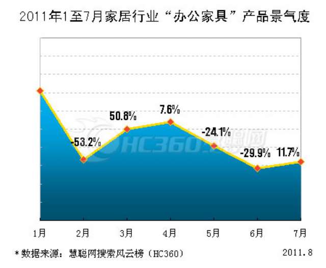 由慧聰網搜索風云榜統計買家數據,我們分析得出7月份“辦公家具”關注指數報告。如圖:從數據分析看三月份的數據達到50.8%是今年7月份之中的最高峰,4月份達到了7.6%,而5、6月份則呈現出了下降的趨勢,而七月份又浙浙的得到了提升。